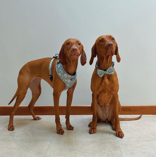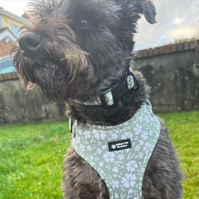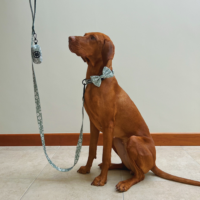 Harness, Collar, Lead, bandana, bow tie & poo bag holder.